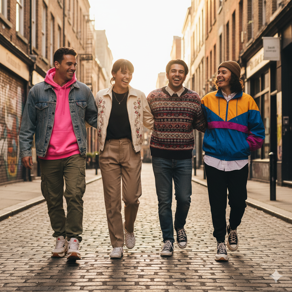 Today’s generation has revived this spirit by blending vintage finds with streetwear staples to create fresh, nostalgic looks. This hybrid fashion culture is all about mixing eras — a vintage denim jacket paired with modern joggers, or a thrifted band tee worn with brand-new sneakers. It’s a style that feels both timeless and forward-thinking.