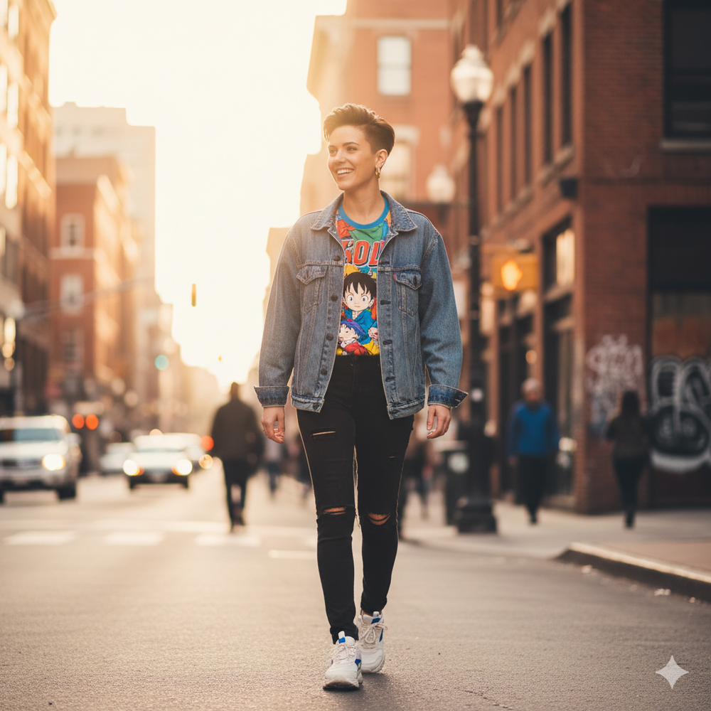 Trendsetters: Mix bold, colorful anime graphics with statement sneakers and layered jewelry.